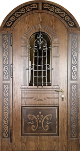 Арочная термодверь с решеткой, стеклом, и панелями МДФ с рисунком и патиной — это сочетание надёжности, эстетики и практичности. Панели из МДФ позволяют реализовать индивидуальные дизайнерские решения при сохранении технических характеристик двери. Создают ощущение уюта и защищённости. Оформление делает дверь не только функциональной, но и визуально привлекательной.