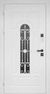 Металлическая непромерзающая термодверь с белой ковкой, стеклом и окрашенными панелями МДФ — идеальное решение для тех, кто хочет подчеркнуть статус и вкус. Панели из МДФ выполняются с точной фрезеровкой, подчёркивающей геометрию и стиль модели. Придают двери индивидуальность, делая её гармоничным элементом интерьера. Дизайн делает дверь не только функциональной, но и визуально привлекательной.