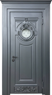 Стальная утепленная термодверь с карнизом, круглым стеклом, серыми панелями МДФ с резьбой — выбор тех, кто ценит комфорт и эстетику. МДФ-панели отличаются прочностью, экологичностью и устойчивостью к внешним воздействиям. Поддерживают стилистическое единство экстерьера и интерьера. Дизайн-проект подойдет для загородного коттеджа в классическом и современном стиле.