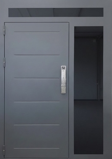 Входная термодверь с остекленными расширениями, выдавленным рисунком, электронным замком и серым порошковым покрытием КД-1398